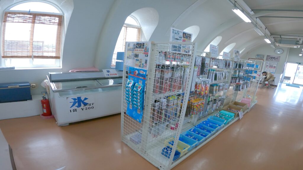 施設内に清潔な水洗トイレが完備されています。また、管理棟の売店では仕掛け、オモリ、冷凍エサ(アミエビやオキアミ)などが購入可能です。ちょっとしたカップラーメンの自動販売機や休憩スペースもあるので至れり尽くせりです。