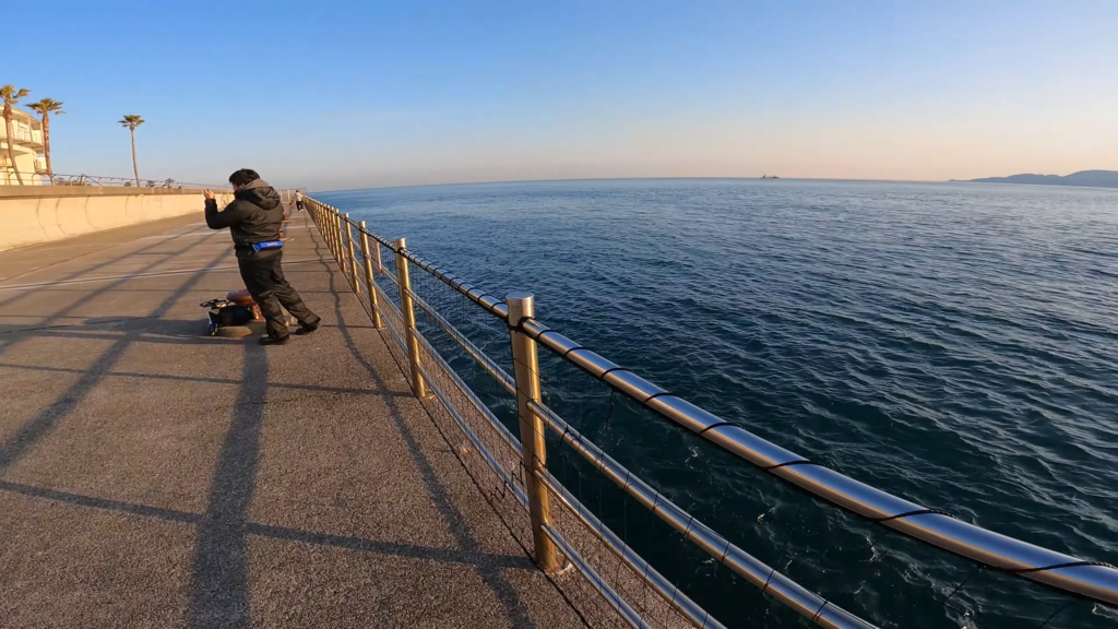 解説:北風が冷たい季節ですが、冬の風物詩である「カレイの投げ釣り」の好ポイントとして有名です。柵に竿を立てかけて、のんびりアタリを待つのが冬の定番スタイルです。