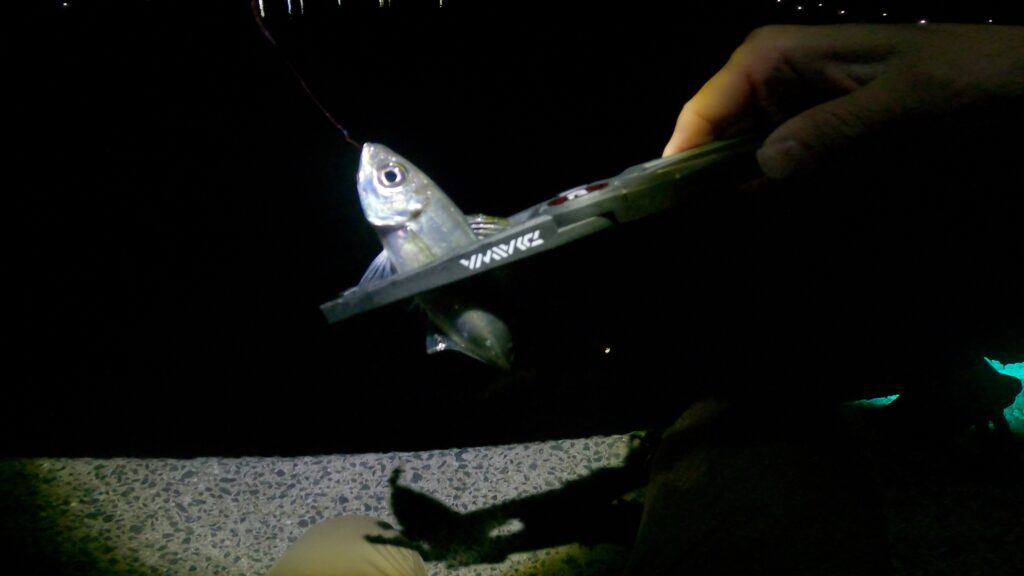 海との間にしっかりとした転落防止の柵があり、足場もフラットなため夜釣りでも極めて安全に楽しめます。潮通しが良く、アジの回遊ルートになっているため実績は十分。常夜灯の明暗部や、潮のヨレ(流れの変化)を軽量ジグヘッドで丁寧に探るのが基本の攻略法です。